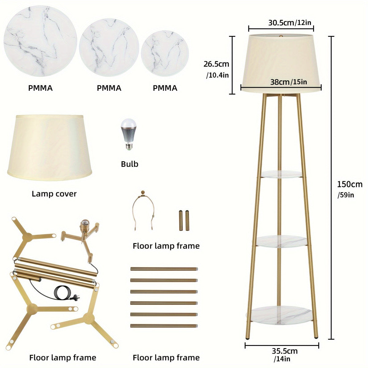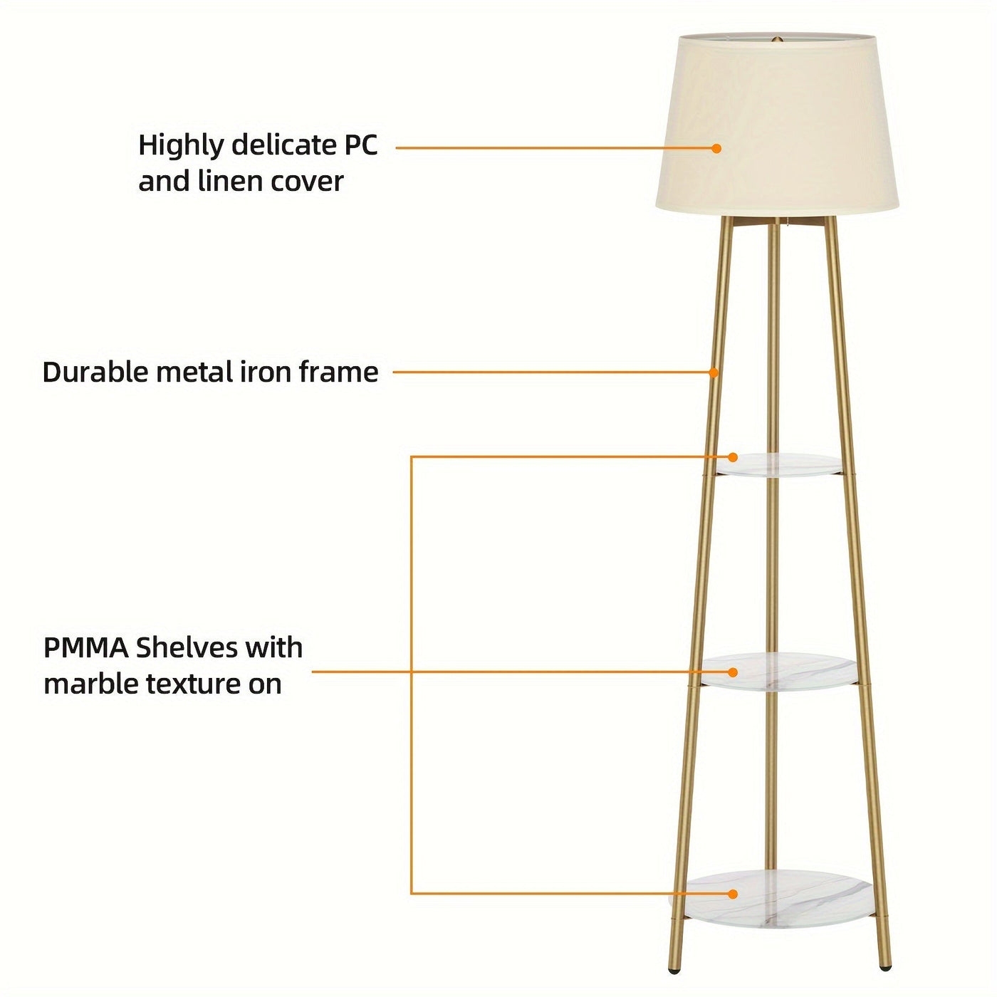 Assemble the tripod frame, add the faux marble shelves, and attach the linen lampshade. Plug in the Radientia Floor Lamp and enjoy both soft ambient light and stylish storage. Place plants, books, candles, or décor on the shelves to maximize utility in small spaces.
