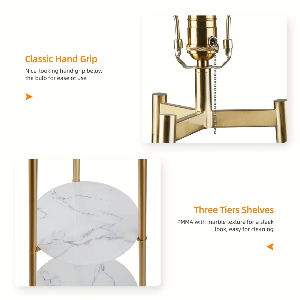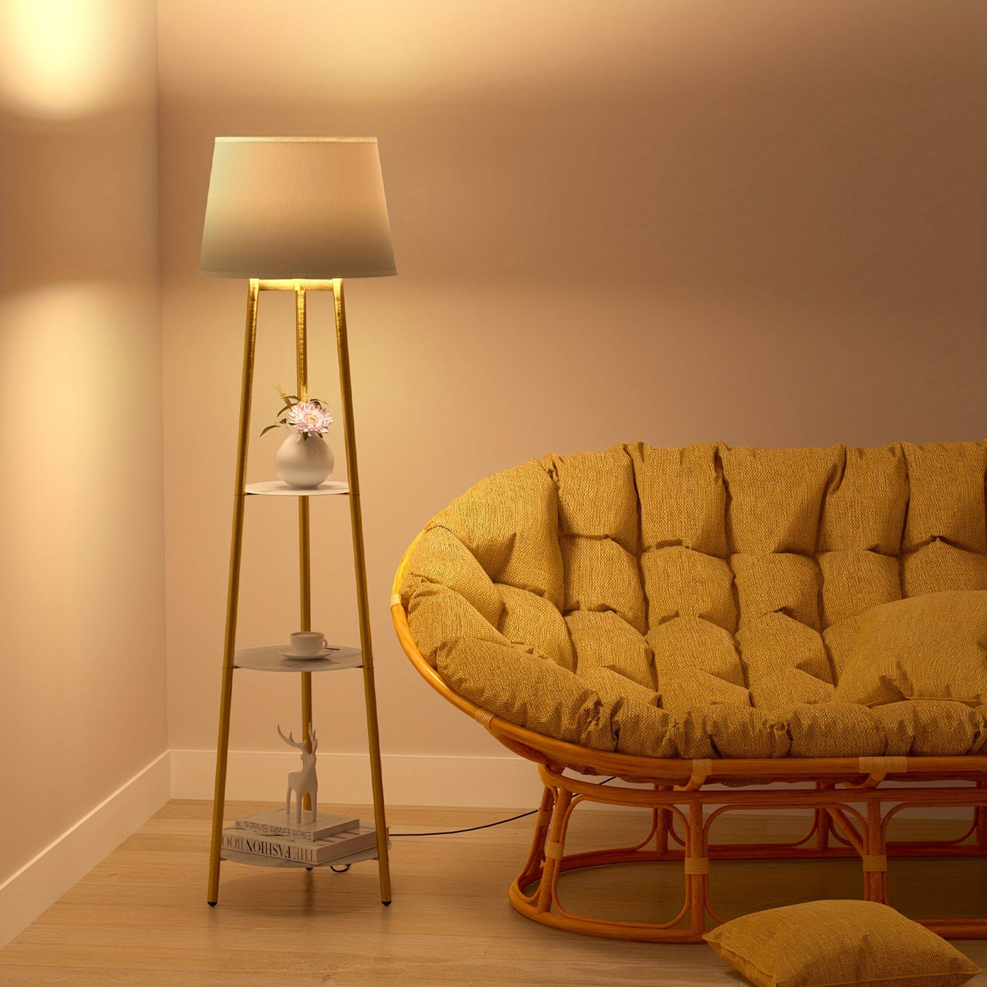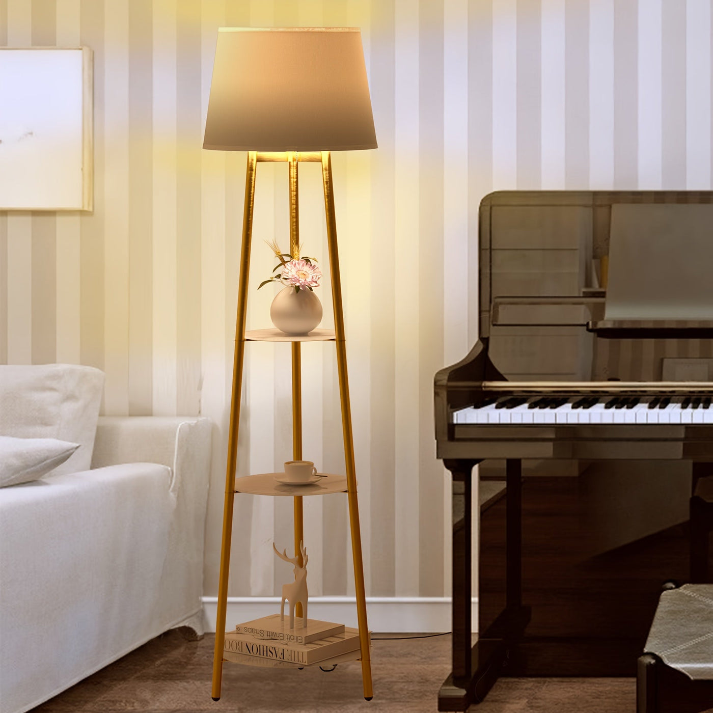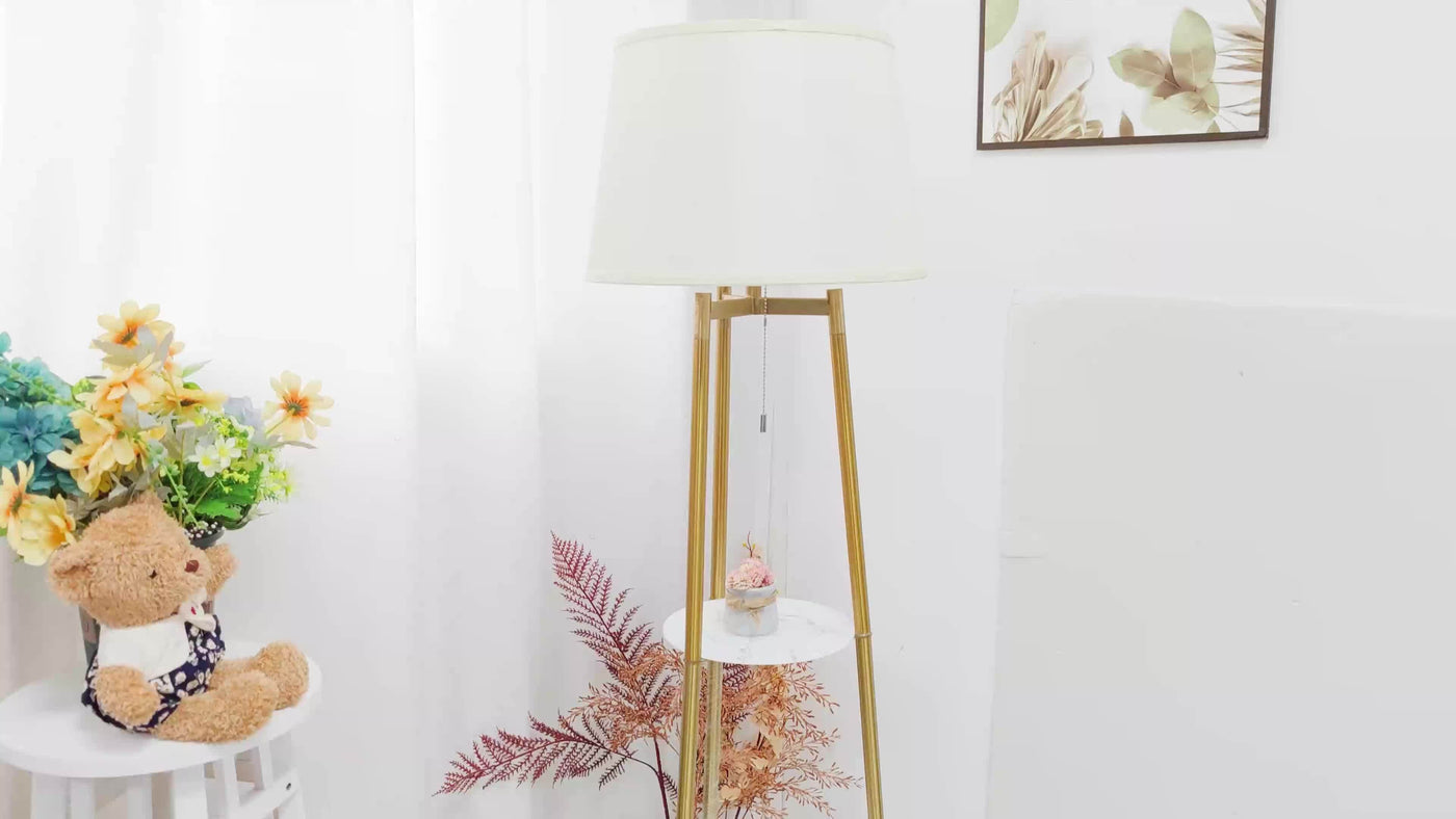 This lamp is more than light—it’s furniture. The golden tripod frame with faux marble shelves blends elegance with practicality, making it an eye-catching addition to any modern home.